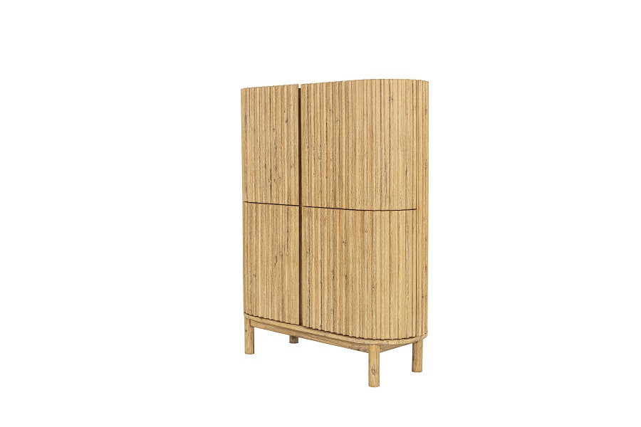 The MC-500 Corfu Cabinet is an elegant and versatile storage piece that blends organic charm with contemporary design. Crafted entirely from solid wood with a natural finish, its vertical slatted surface adds visual rhythm and warmth to any interior. The cabinet features four front doors that open to reveal a spacious interior with rounded shelving, perfect for organizing tableware, linens, or decorative items. Its gently curved sides and elevated base provide a modern touch while maintaining a soft, artisanal character. Ideal for living rooms, dining areas, or even stylish entryways.