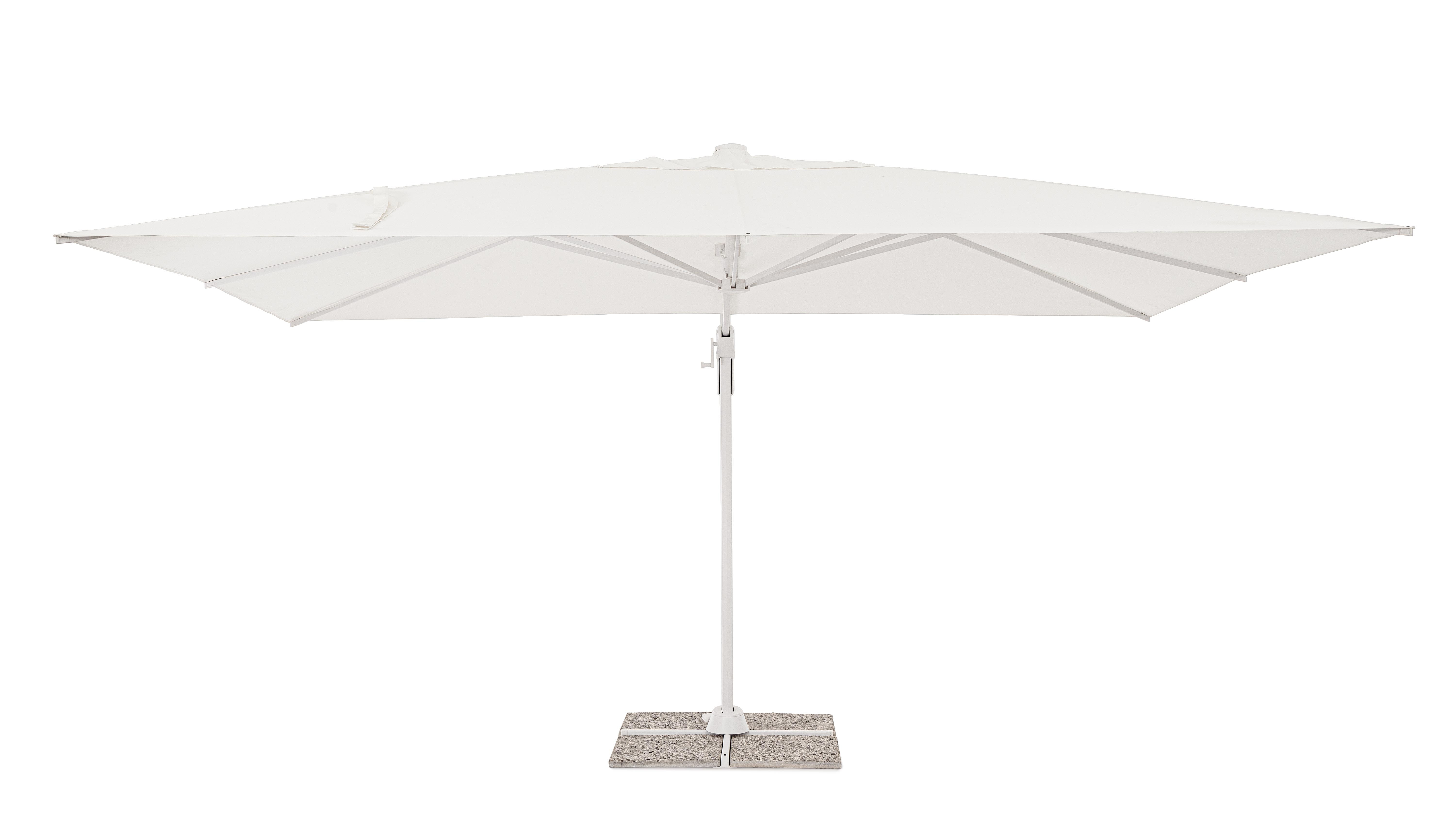 The Vega Parasol is a perfect addition to your outdoor space, combining functionality with elegance. Designed with a sturdy powder-coated aluminum frame and a sleek white cover, this parasol offers excellent shade and style. Featuring a 360° rotating pole with a convenient pedal and a vertical tilt with a 5-position handle, it allows for easy adjustments to protect you from the sun all day long. The parasol comes with a steel cross base, cement tiles are not included! We recommend using two or more sets of cement base tiles for secure installation.