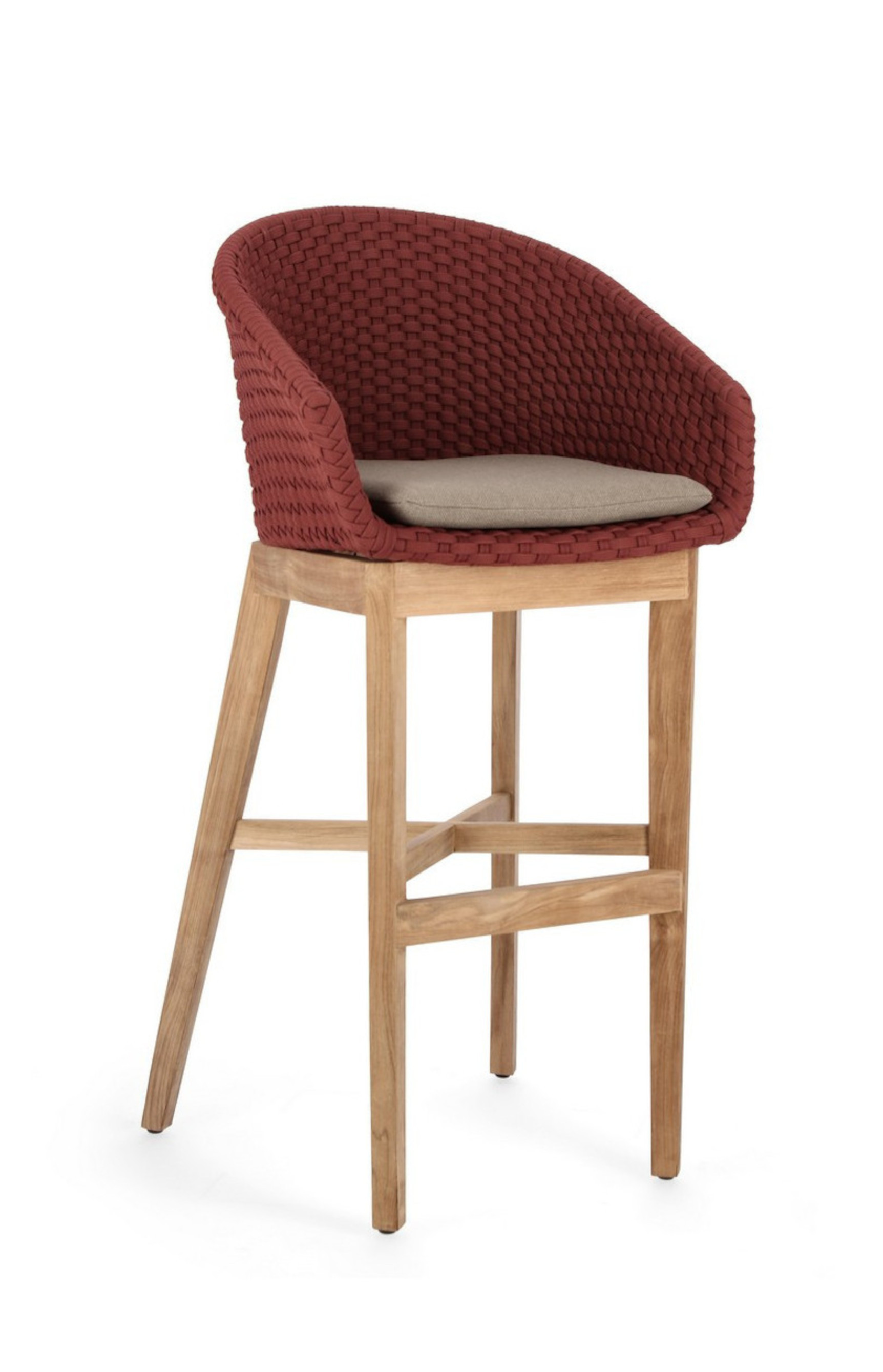The Coachella Bar Stool combines modern design with practical features, making it a stylish addition to any outdoor bar or high dining area. This stool features a seat constructed with a durable aluminum frame and adorned with intricate Olefin rope weaving, providing both comfort and visual appeal. The seat cushion is covered in Sunproof Olefin water-repellent fabric and is removable for easy maintenance. The legs of the stool are crafted from teak, sourced from SVLK-certified Indonesian legal wood, ensuring both sustainability and elegance.