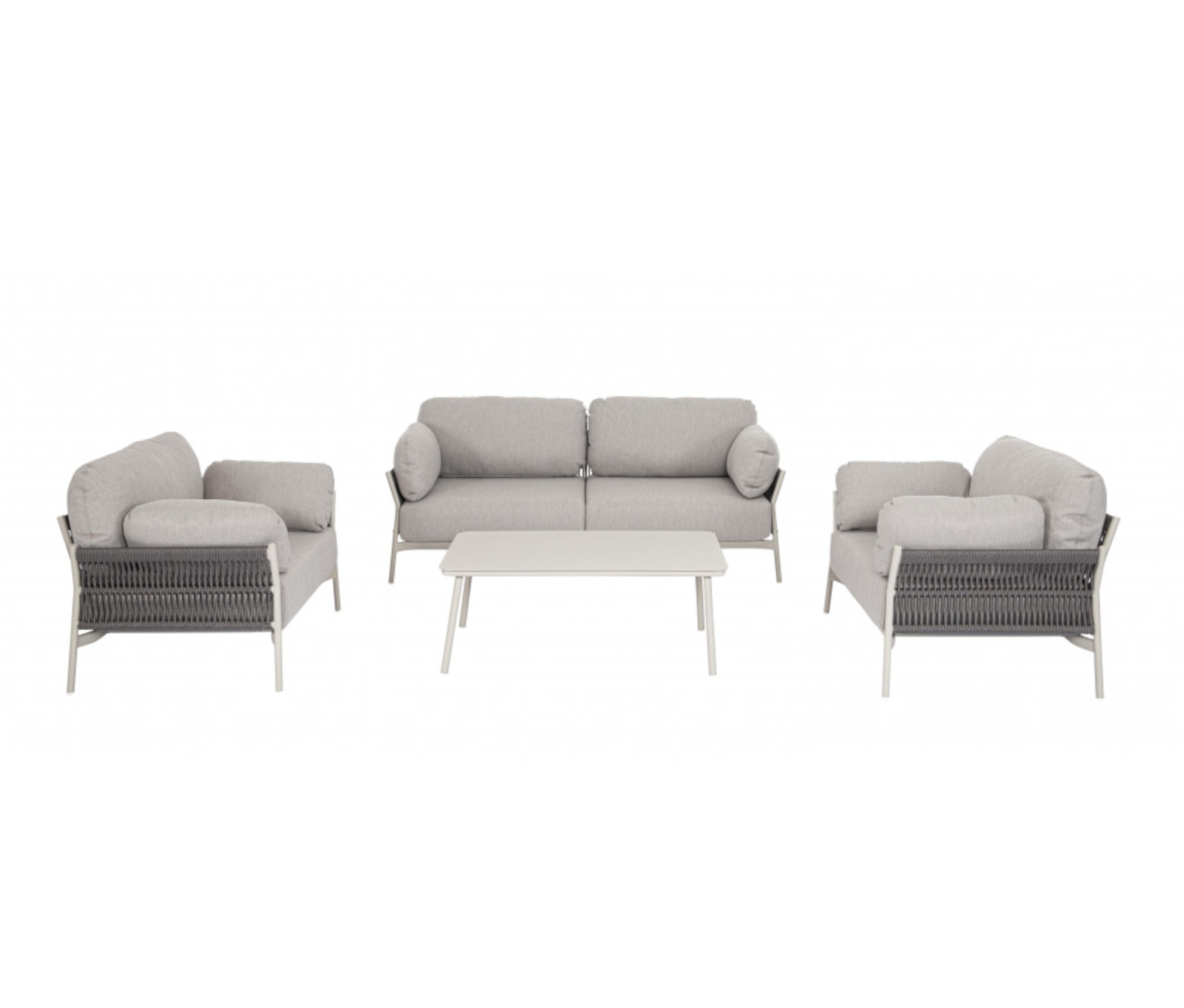 The Pardis Sofa Set is a sophisticated and stylish addition to any outdoor living space. Crafted with an elegant aluminium frame, this set offers both durability and contemporary design. The intricate rope weaving in olefin fabric adds a touch of texture and visual interest, enhancing the overall aesthetic appeal. The set includes seat and back cushions, each with removable covers made from water-repellent olefin fabric, ensuring they remain pristine and comfortable in various weather conditions. Perfect for relaxing or entertaining, this set includes one spacious sofa, two comfortable armchairs, and a sleek centre table, creating a cohesive and inviting seating area.