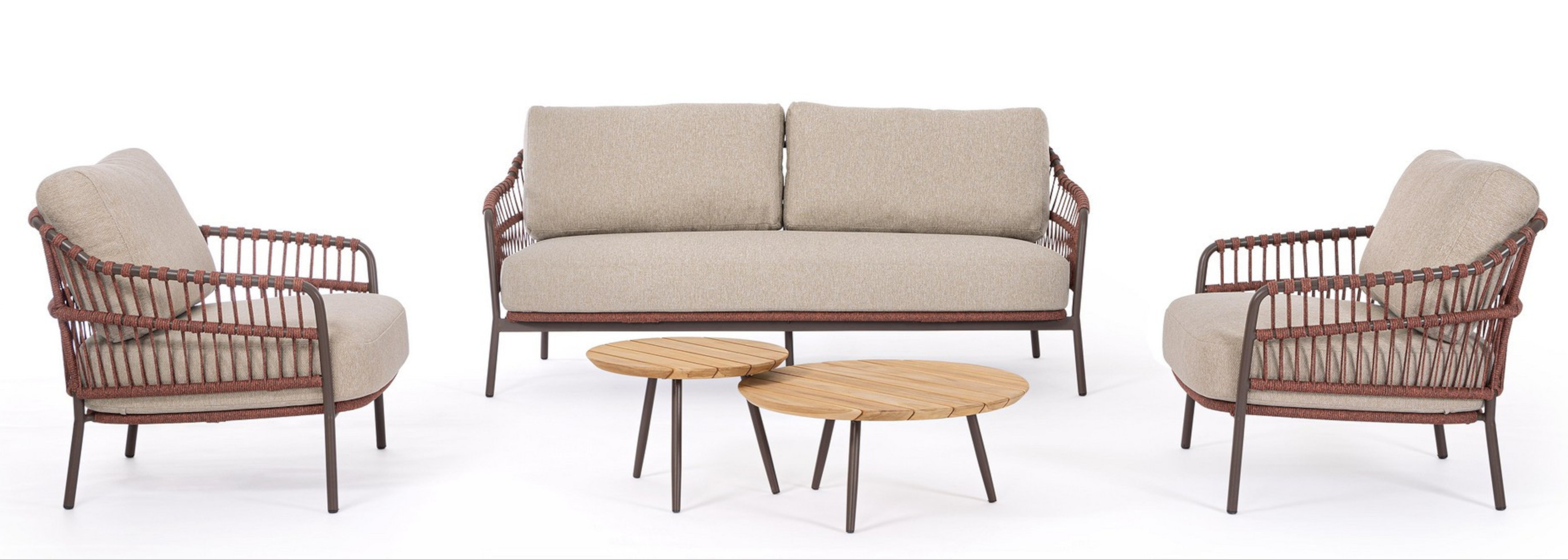 The Talaia Sofa Set combines modern elegance with premium craftsmanship, making it the perfect addition to sophisticated outdoor and indoor spaces. The structure is enhanced with a durable rope weave, designed for outdoor use, lending a relaxed yet refined aesthetic.
